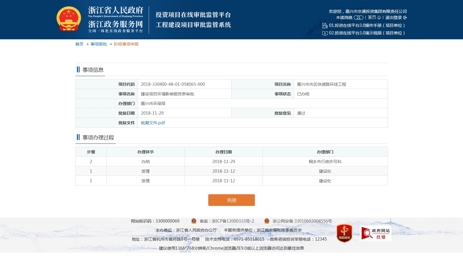 嘉興市市區(qū)快速路環(huán)線工程一期建設項目環(huán)境影響報告表審批